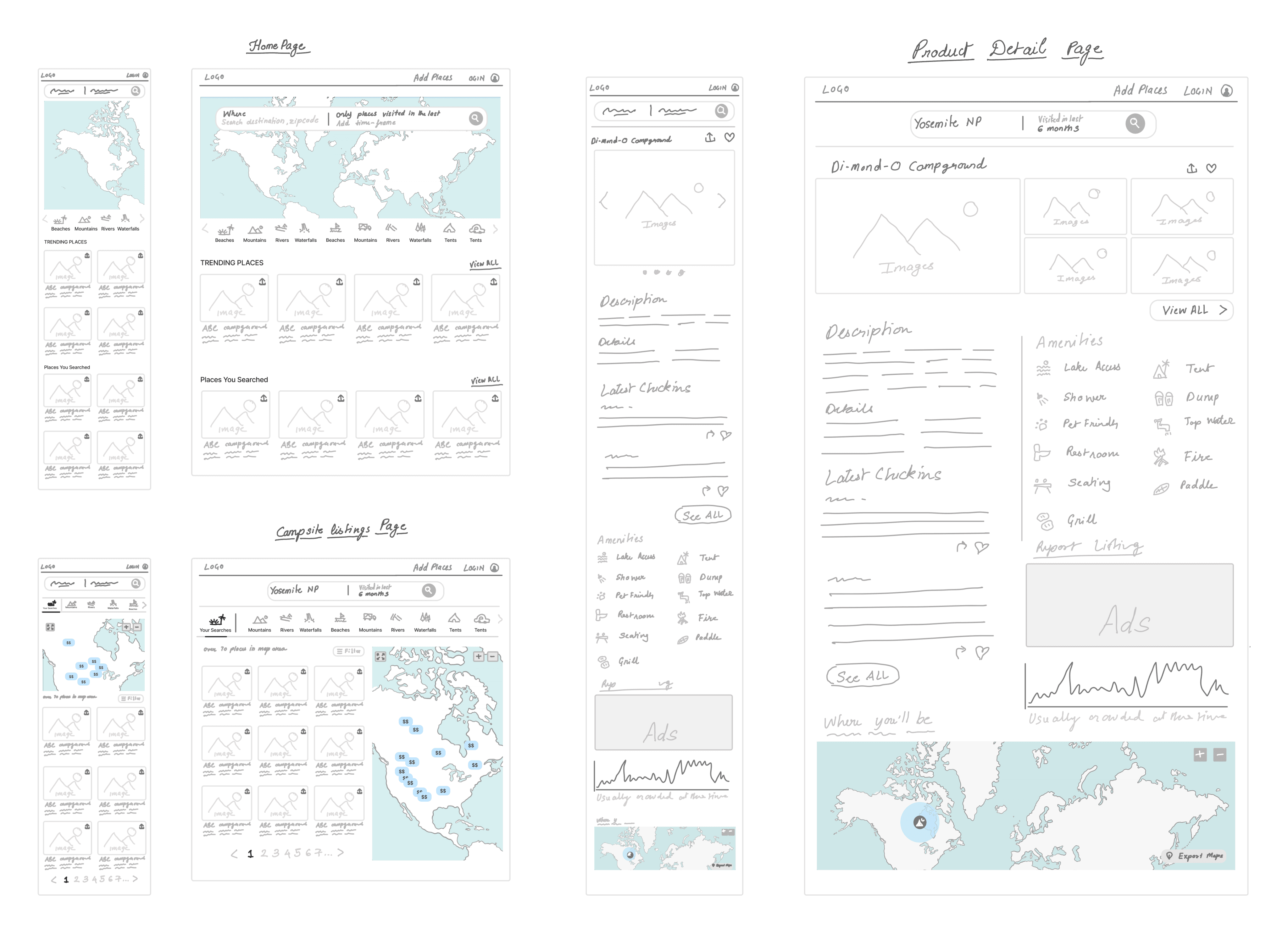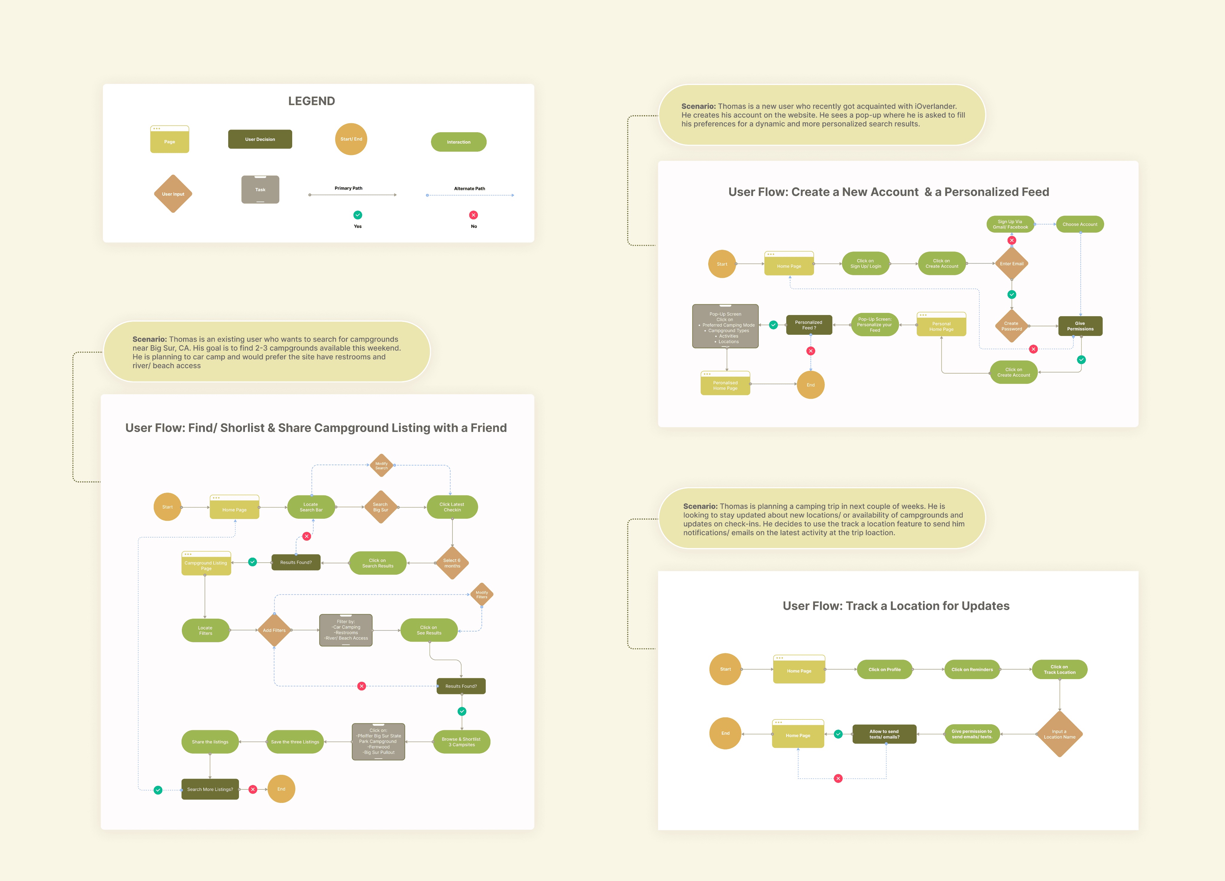 To design a user-friendly platform, we mapped out key user flows. We focused on the "Find/Shortlist & Share Campground Listing with a Friend" flow, as it highlights the social aspect of camping.