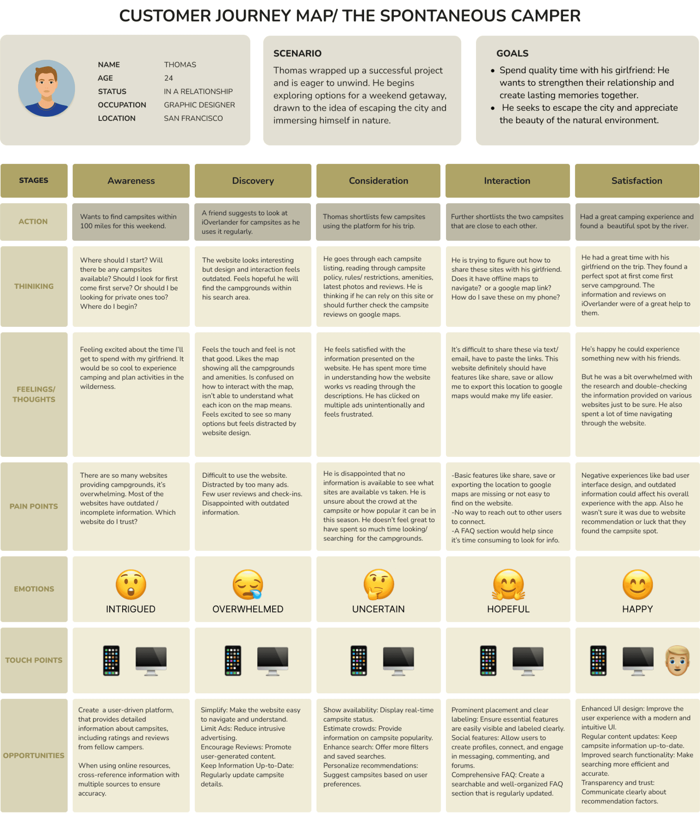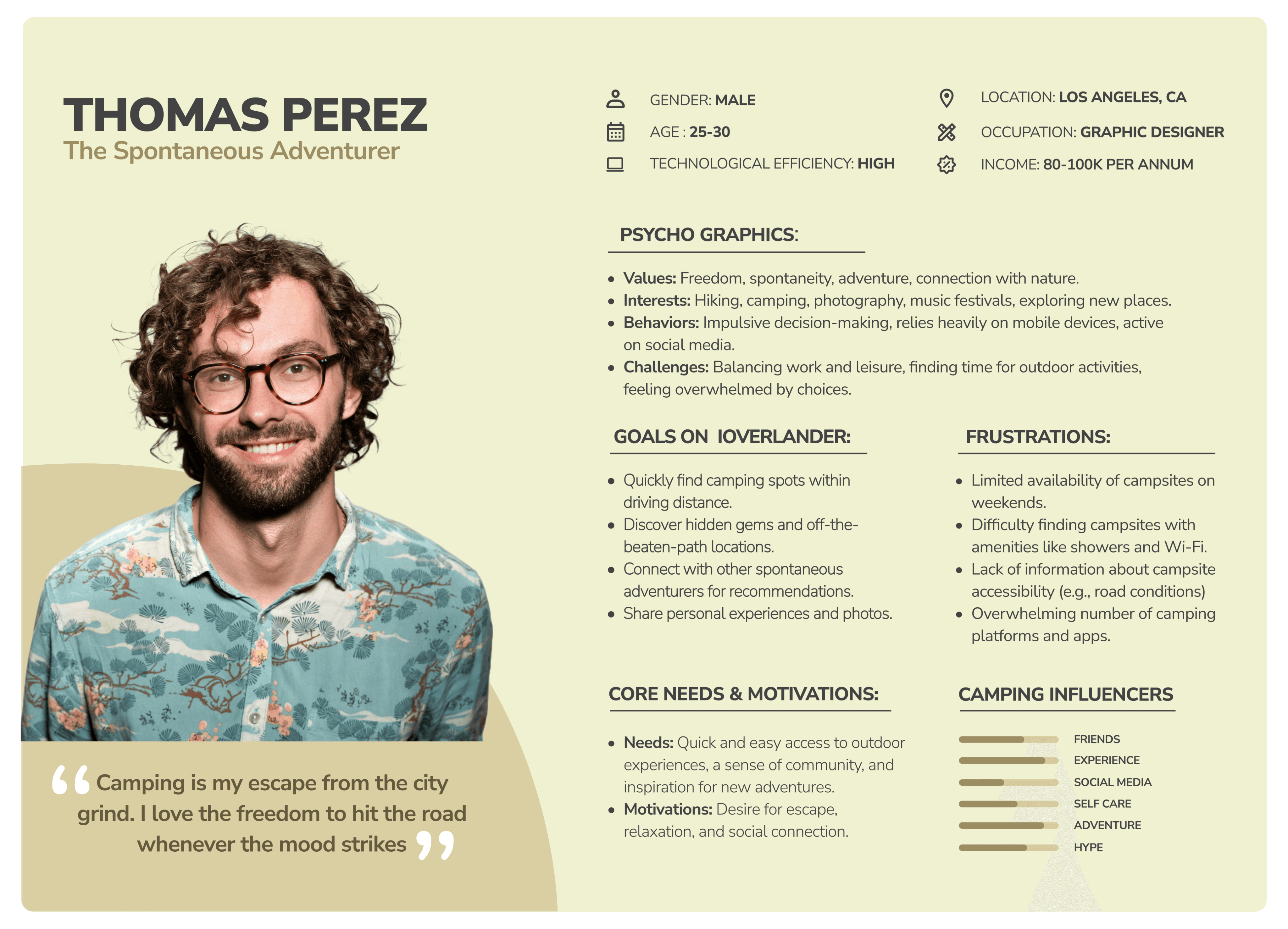 Thomas, a young, tech-savvy designer, seeks a quick weekend escape. He turns to iOverlander to find nearby campsites. However, he faces challenges with a cluttered interface, outdated information, and a complex booking process.