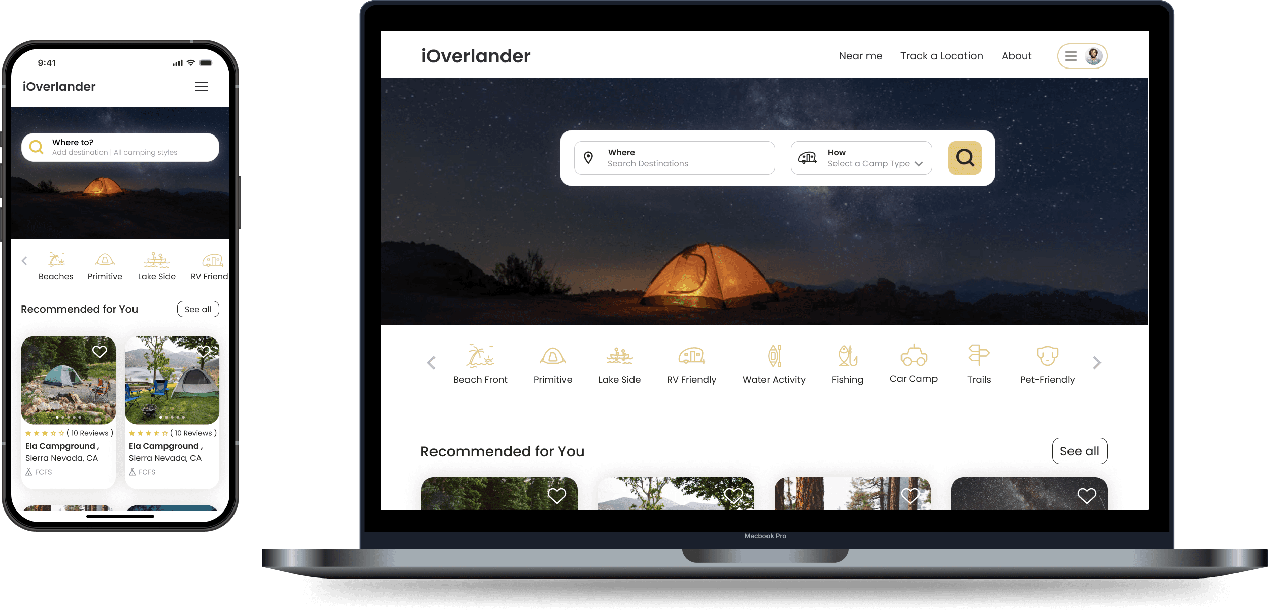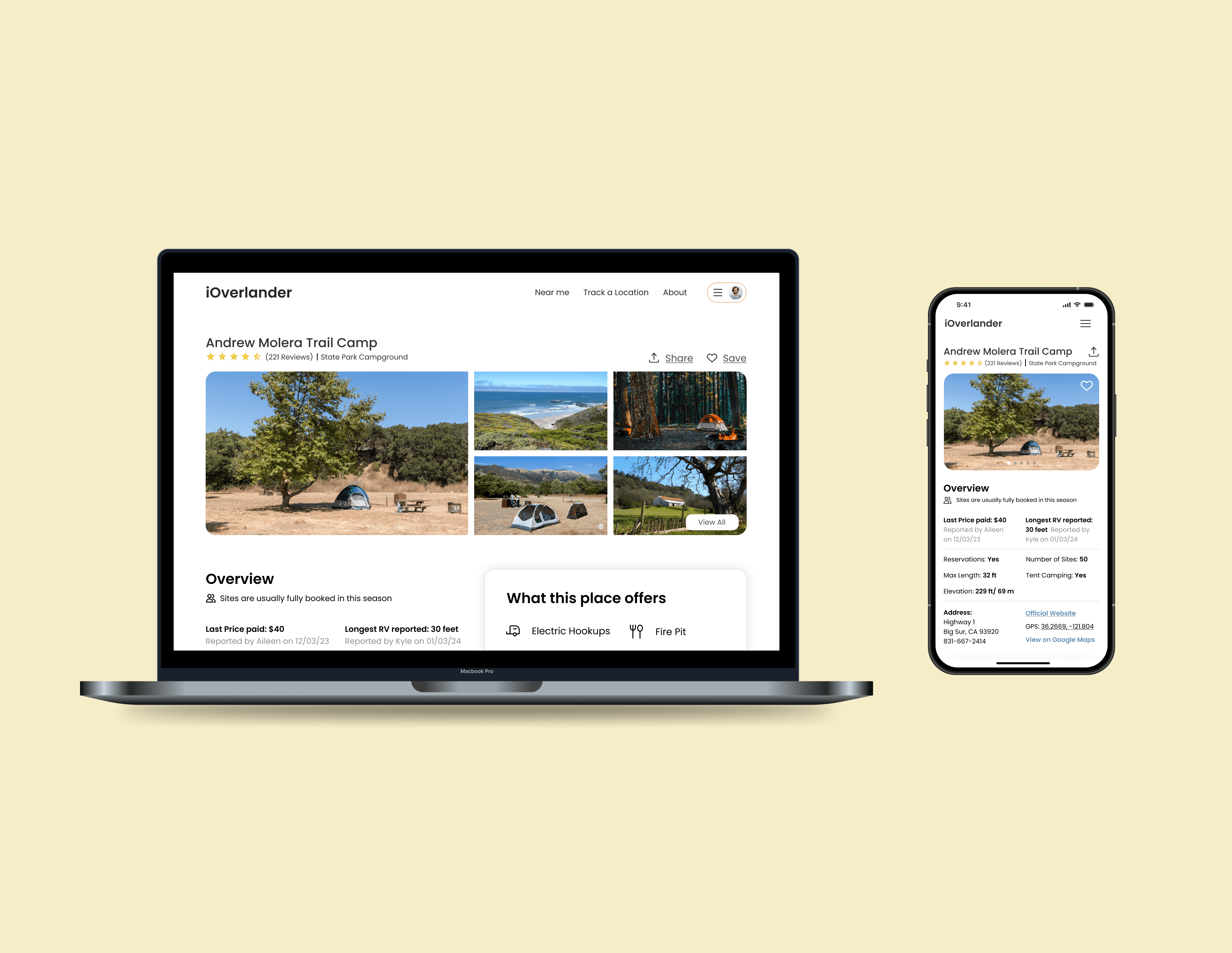 To showcase the redesigned IOverlander platform, a high-fidelity prototype was created. The videos demonstrate the process of searching for campsites, filtering results, and exploring detailed campsite information.